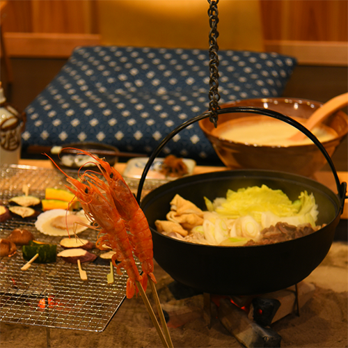 地元食材を使ったお食事は、自慢の囲炉裏で。郷土料理の「とろろ汁」を自然薯をするところから一緒に作る体験が人気です。夏には外でBBQを楽しむこともできますよ。